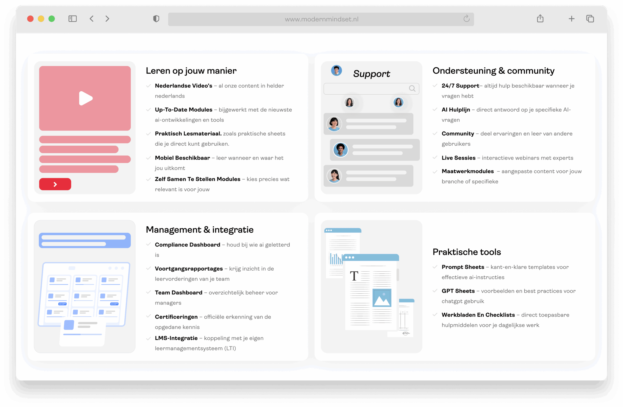 AI werkt pas als de basis klopt. En dat gaat niet over technologie. Dat gaat over de mensen die ermee werken. Hoe bereid jij ze voor? Modern Mindset is het Nederlandse e-learningplatform dat het MKB en het onderwijs helpt medewerkers te ontwikkelen tot AI-vaardige professionals die AI begrijpen en ermee uitblinken.
